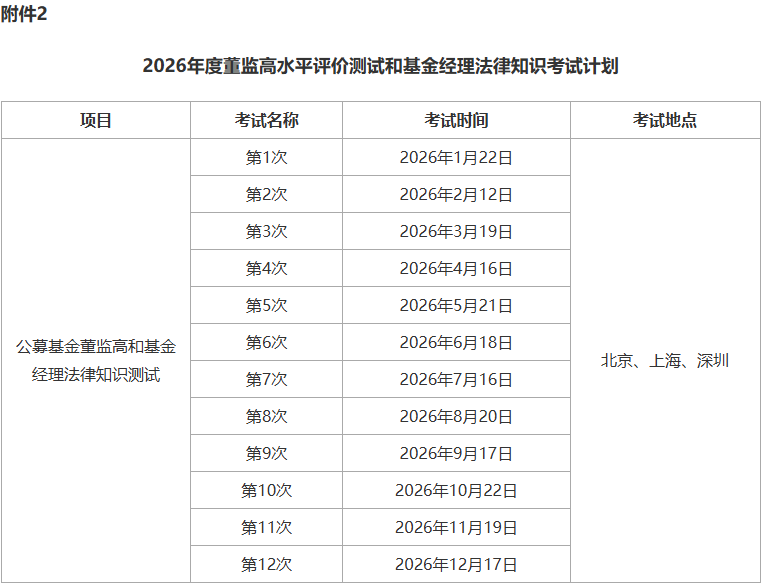 二、董监高水平评价测试和基金经理法律知识考试拟在北京、上海、深圳举办12次。