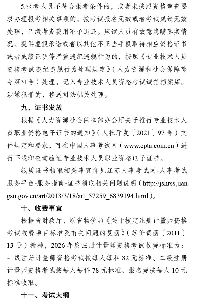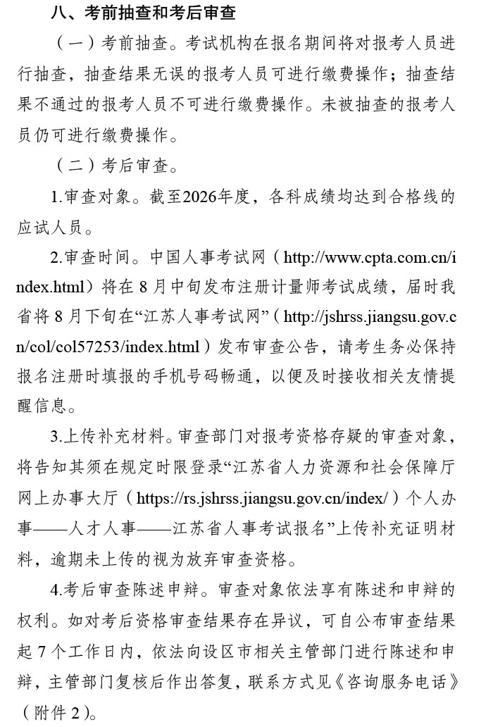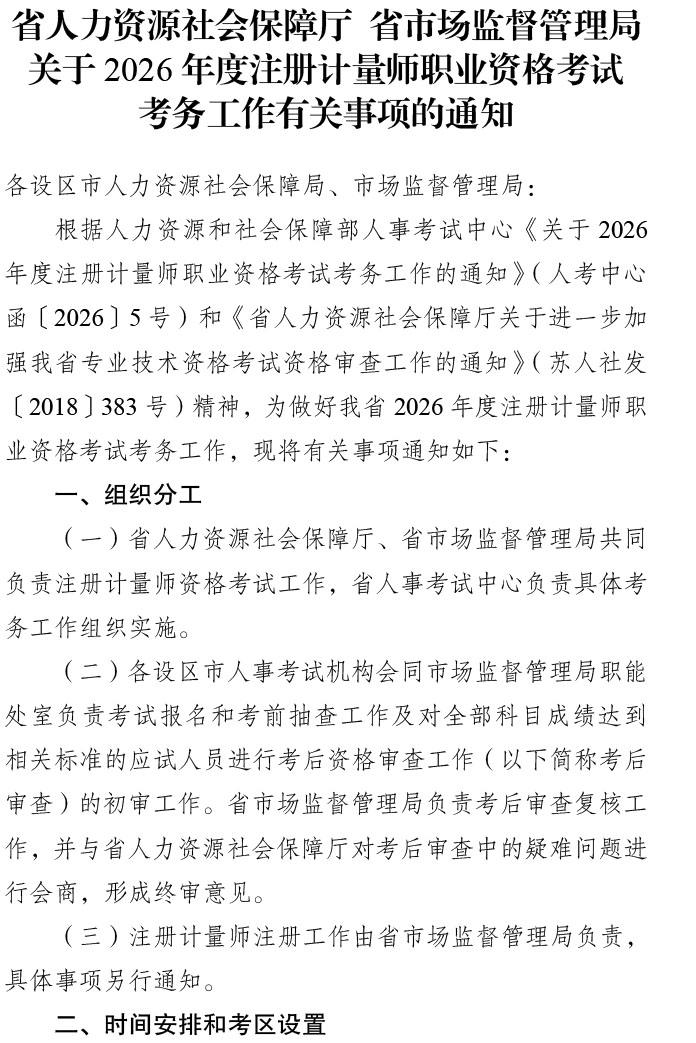 2026年江苏注册计量师考试报名时间为4月1日9:00-4月20日16:00,网上缴费时间为4月1日-4月22日;准考证打印时间为6月8日-12日;成绩查询时间为8月中旬。